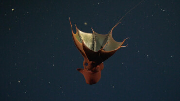 This vampire squid (Vampyroteuthis infernalis) was imaged during the ‘Designing the Future 2’ expedition at 630 m in the East Cortes Basin. The vampire squid is a relict species, meaning it’s the only animal left in the order Vampyromorphida. Despite its name, it is neither a vampire nor a true squid, though its species name “infernalis” means “of hell” in Latin. Image courtesy of Schmidt Ocean Institute.