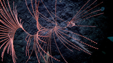 A spiralling golden octocoral (Iridogorgia) reaches out into the moving current to catch food from the cold waters of the deep ocean (~1,950 m). Image courtesy of Schmidt Ocean Institute.